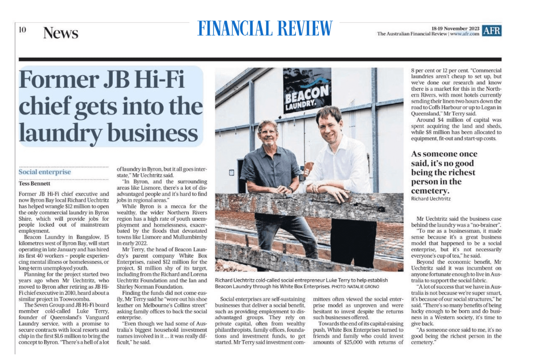 WBE raises $12M in philanthropy and impact investment to guarantee the opening of the social enterprise commercial laundry in Bangalow, in Northern NSW. Former JB Hi Fi CEO and philanthropist Richard Uechtritz is a key supporter and donor, alongside the Ian and Shirley Norman Foundation.March 2024Financial Wellbeing Program delivering incredible returns